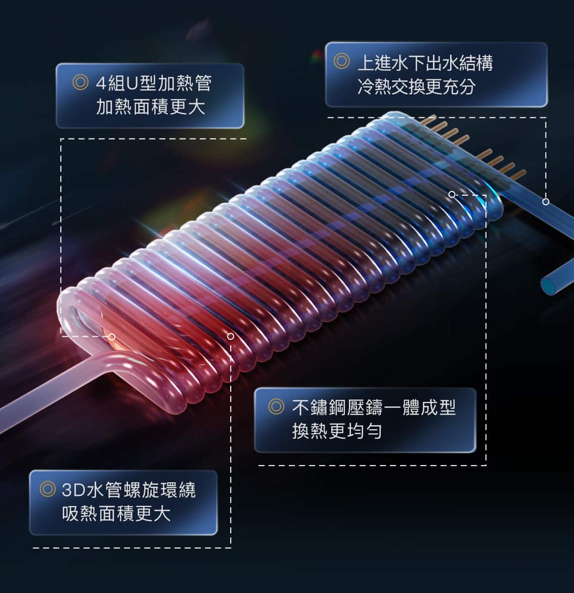 升級3D立體加熱系統,過水加熱模式,不儲存熱水,無散熱損失